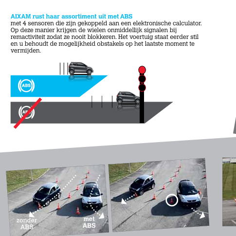 Daarnaast zijn AIXAM-brommobielen als optie verkrijgbaar met ABS (Anti-Blokkeer Systeem). Dit systeem voorkomt dat de wielen blokkeren tijdens hard remmen, vooral op een glad wegdek, waardoor u het voertuig stuurbaar houdt tijdens het remmen.