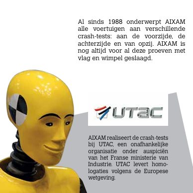 AIXAM was de eerste fabrikant van brommobielen die veiligheid structureel serieus nam. Al decennialang onderwerpen wij al onze modellen aan uitgebreide crash-tests aan de voor-, zij- en achterkant, terwijl de wetgeving dit niet eens verplicht. Tot op de dag van vandaag is AIXAM de enige brommobielfabrikant die al deze autotests met succes heeft doorstaan.